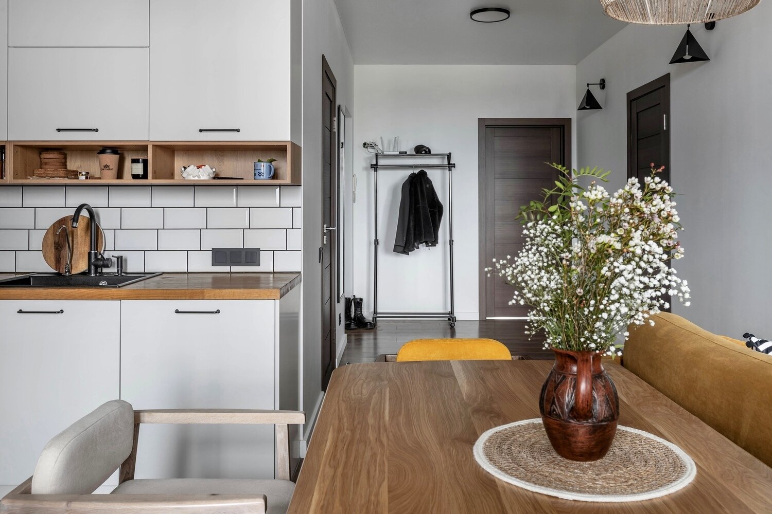 Прихожую не стали отделять перегородками, чтобы оставить пространство и объем.