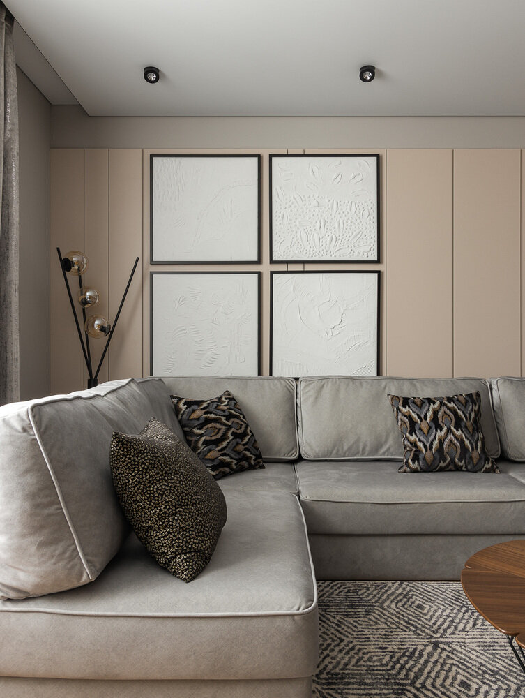 В гостиной использовали сложное оформление стен с помощью панелей. Они стали отличным фоном для современного искусства и привнесли динамику в интерьер.