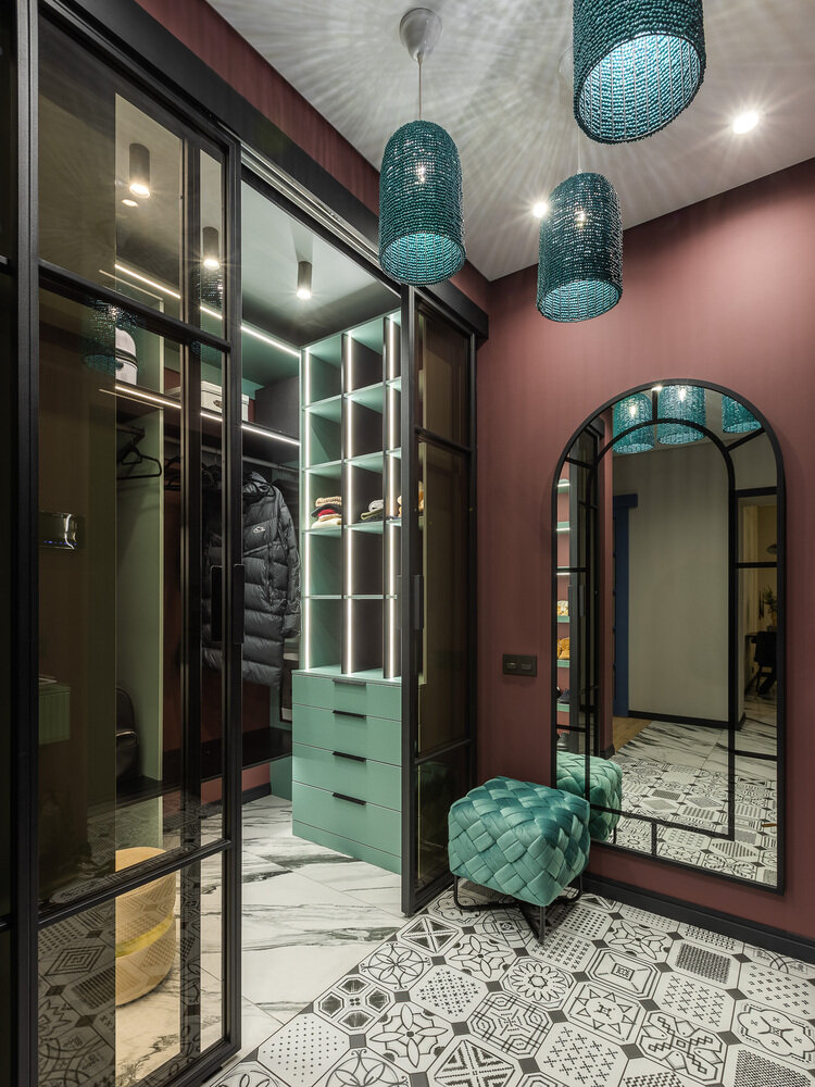 Все системы хранения сделаны из МДФ в покраске с комбинациями ЛДСП. Подбирались выкрасы, нужно было смотреть все в комбинации с остальными материалами.