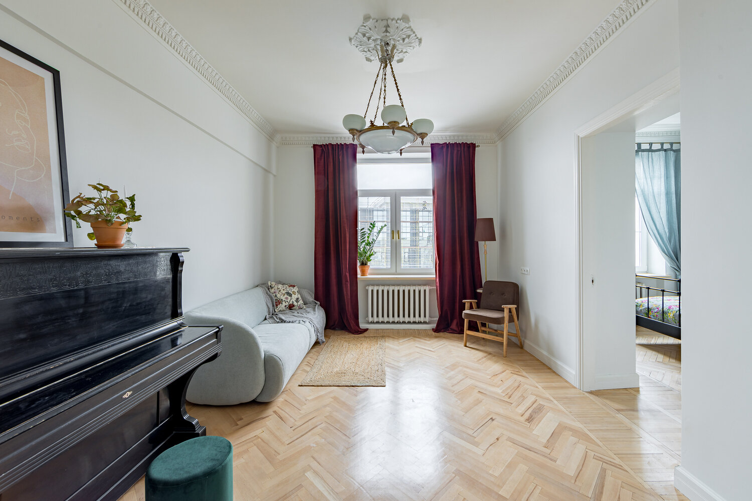 Фотография: Гостиная в стиле Скандинавский, Эклектика, Винтажный, Квартира, Проект недели, Москва, Сталинка, Кирпичный дом, 2 комнаты, 40-60 метров, Анастасия Разливанова, Ольга Гусева – фото на INMYROOM