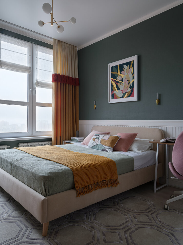 «Приятное дополнение от застройщика в квартире — большое окно в спальне, для оформления которого мной был придуман дизайн портьер с намеком на французскую эстетику. Я использовала два вида бархата и разделила их ярким кантом из бахромы. На данный момент это самый необычный дизайн портьер, который мне удалось реализовать в проекте», — делится дизайнер.
