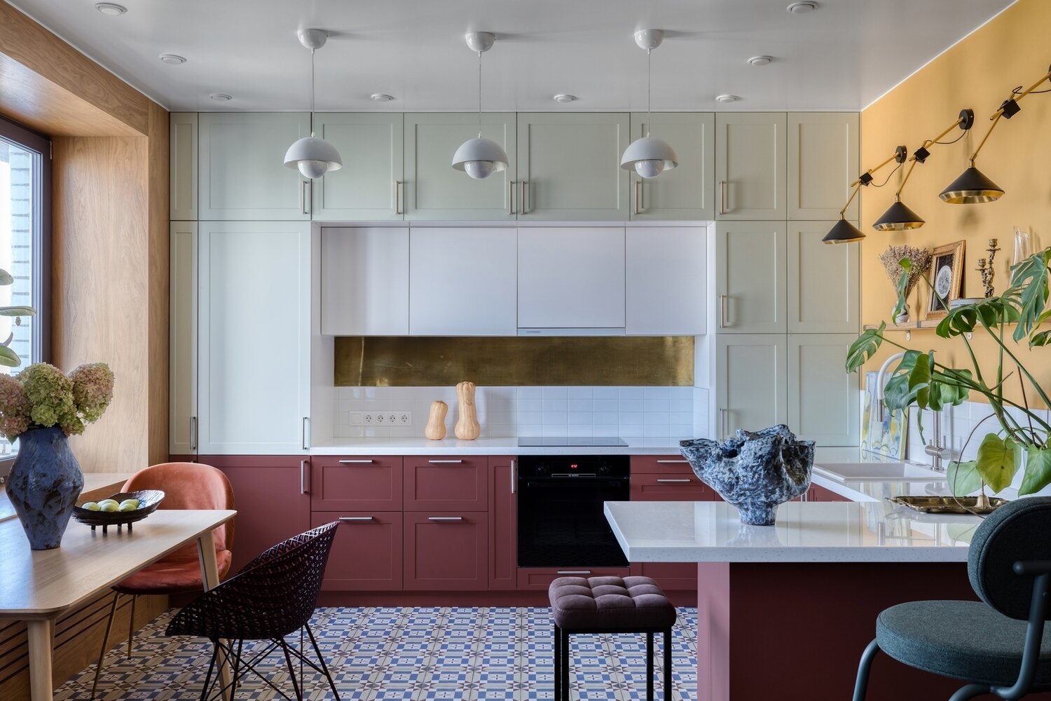 Фартук оформили белым «кабанчиком» и листом латуни. Золотистая латунь эффектно смотрится на фоне желтых стен и сочетается с золотистыми аксессуарами.