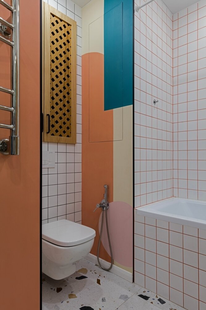 Стены, куда не попадет вода, окрашены в оранжевый, желтый, бирюзовый по принципу колорблокинга.