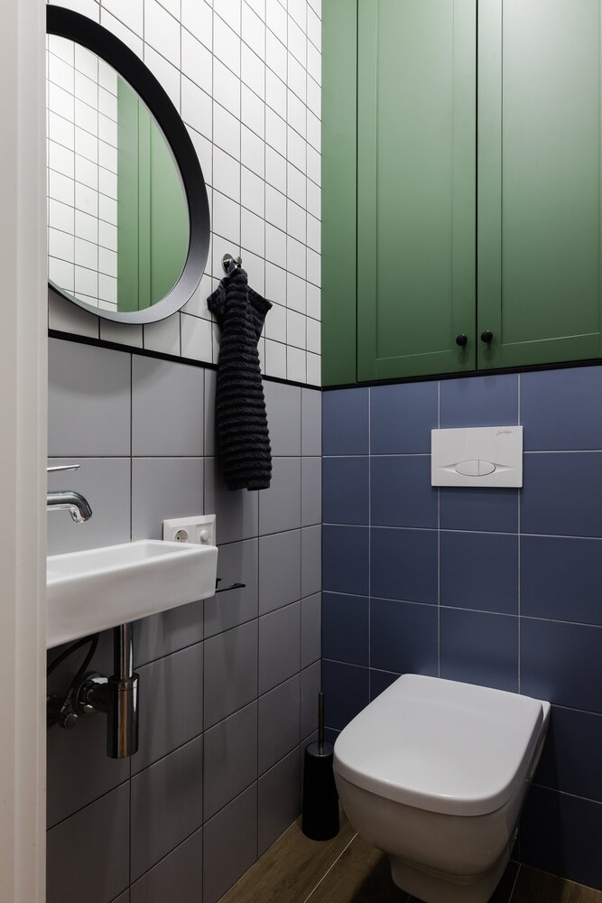 Белая, серая и синяя плитка сочетается с зеленой краской на стенах и керамогранитом под дерево на полу.