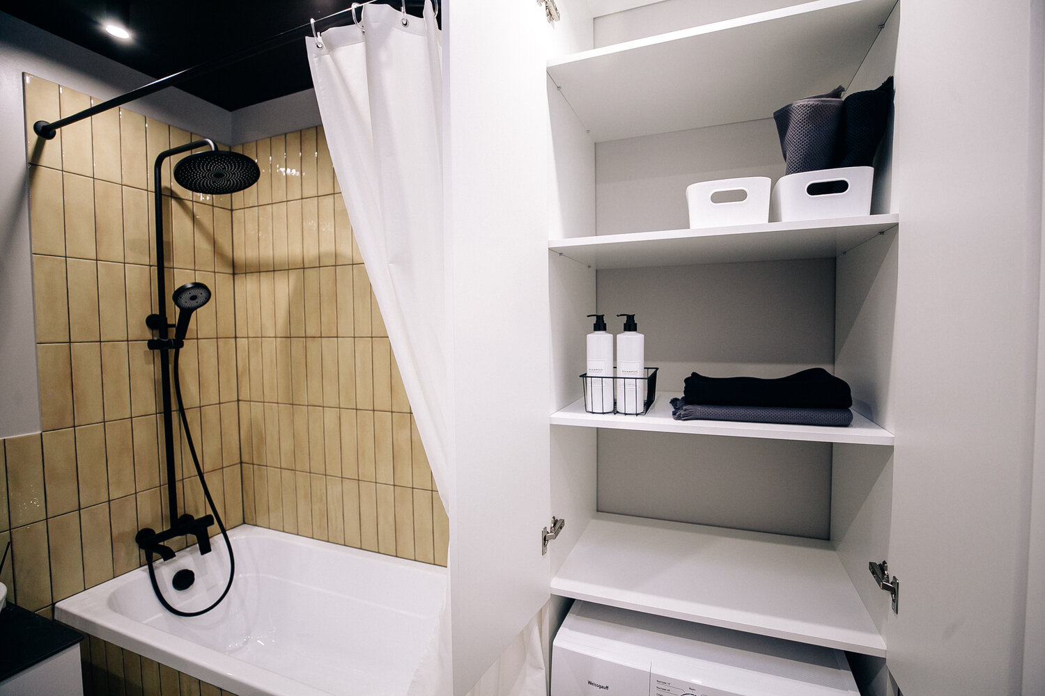 Нестандартное решение — черный потолок. Он придает помещению оригинальность и изюминку.