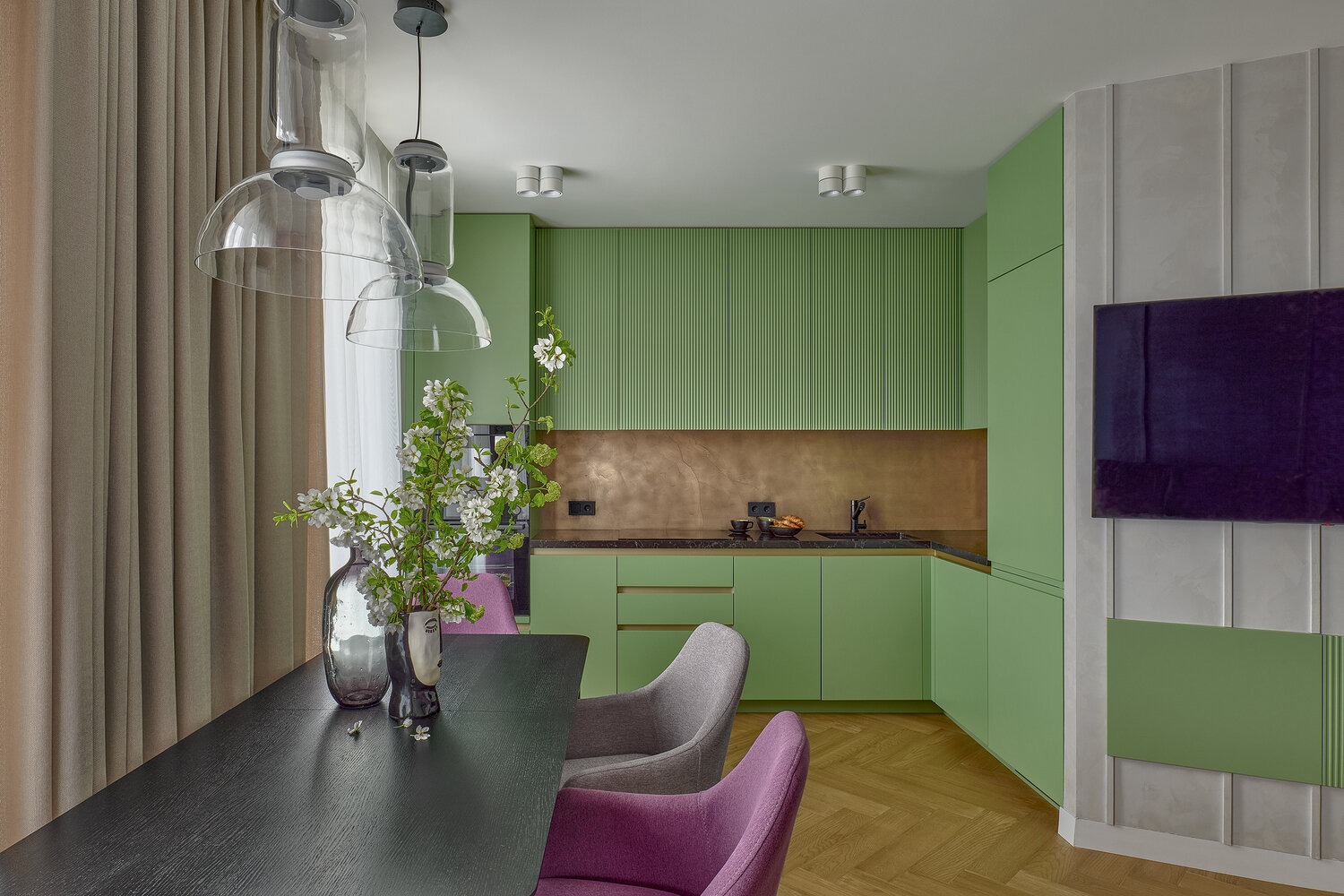 Кухонный гарнитур изготавливался на заказ. Он достаточно небольшой, поэтому каждый сантиметр пространства шкафов обсуждался при проектировании.