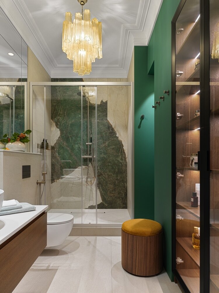 Эффектный запоминающийся интерьер ванной удалось создать при помощи крупноформатного керамогранита и яркого зеленого тона стен.