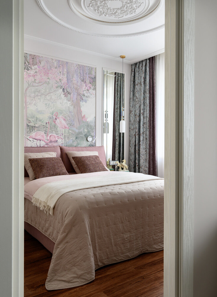 В спальне цветовая палитра декора и текстиля в более спокойном, приглушенном исполнении с доминированием растяжки розового оттенка.