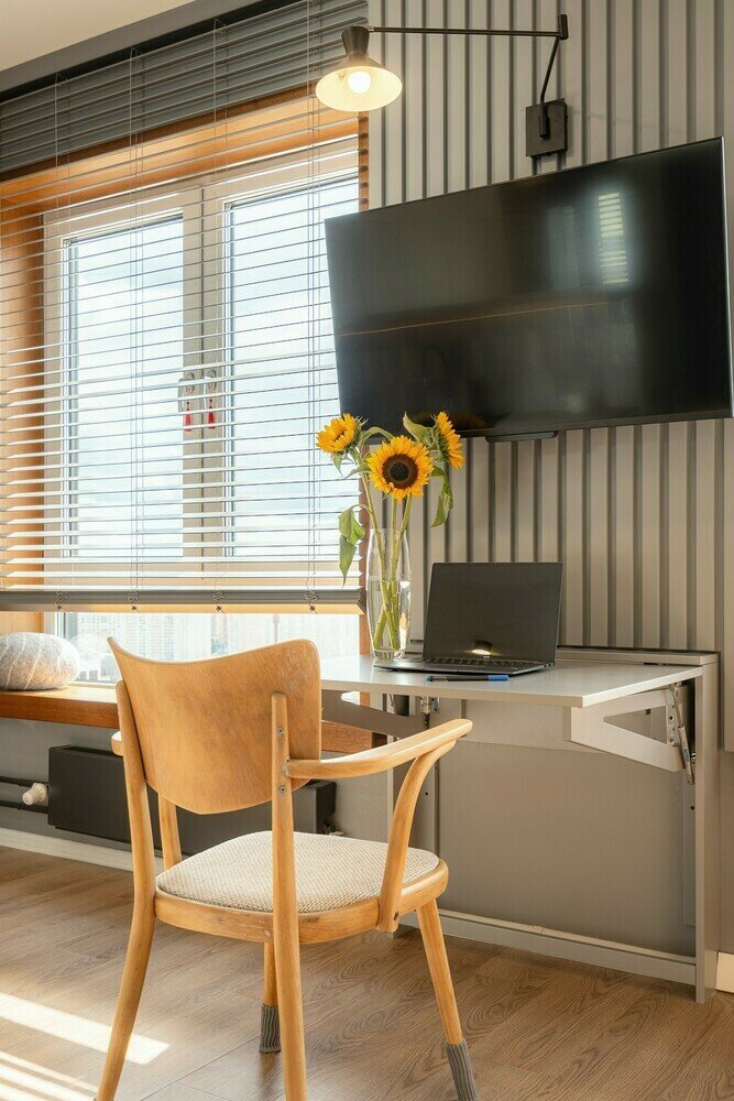 Телевизор на кронштейне легко поворачивается и в сторону дивана, и в сторону кухни.