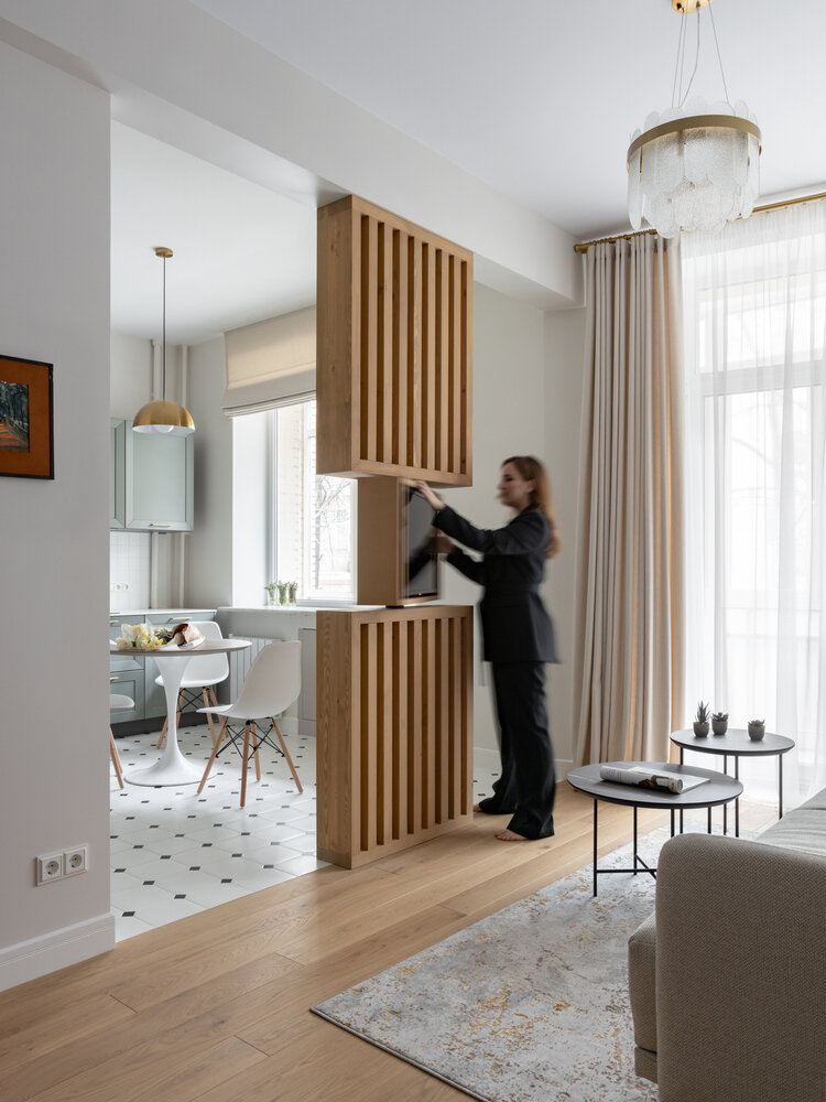 Фотография: Гостиная в стиле Скандинавский, Современный, Квартира, Проект дня, Москва, Кирпичный дом, 2 комнаты, 60-90 метров, Тая Кипри – фото на INMYROOM