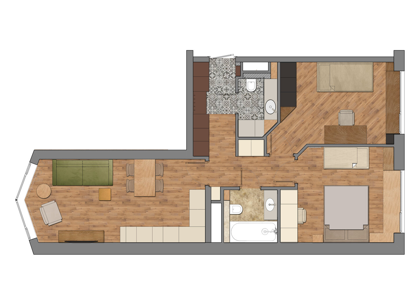 Двухкомнатная квартира 67 м² для семьи с двумя детьмиДизайн