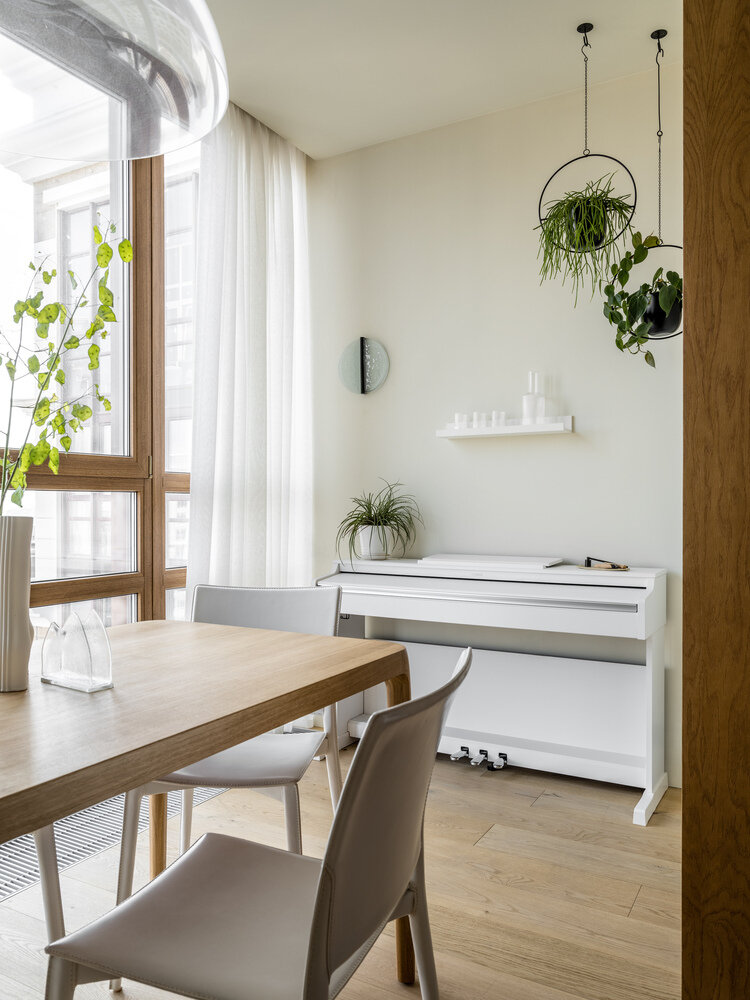 Бра около пианино сделано на заказ. Дизайнеры увидели в мастерской кусок толстого стекла правильной формы, поняли, что может получиться интересный светильник. В итоге в стекло интегрировали диодную ленту, и получилось бра с очень приятным ненавязчивым свечением.