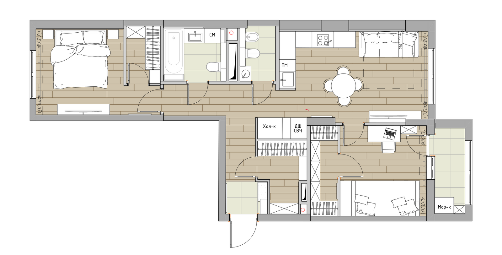 Элегантный интерьер трешки 70 м² с интересной отделкойДизайн