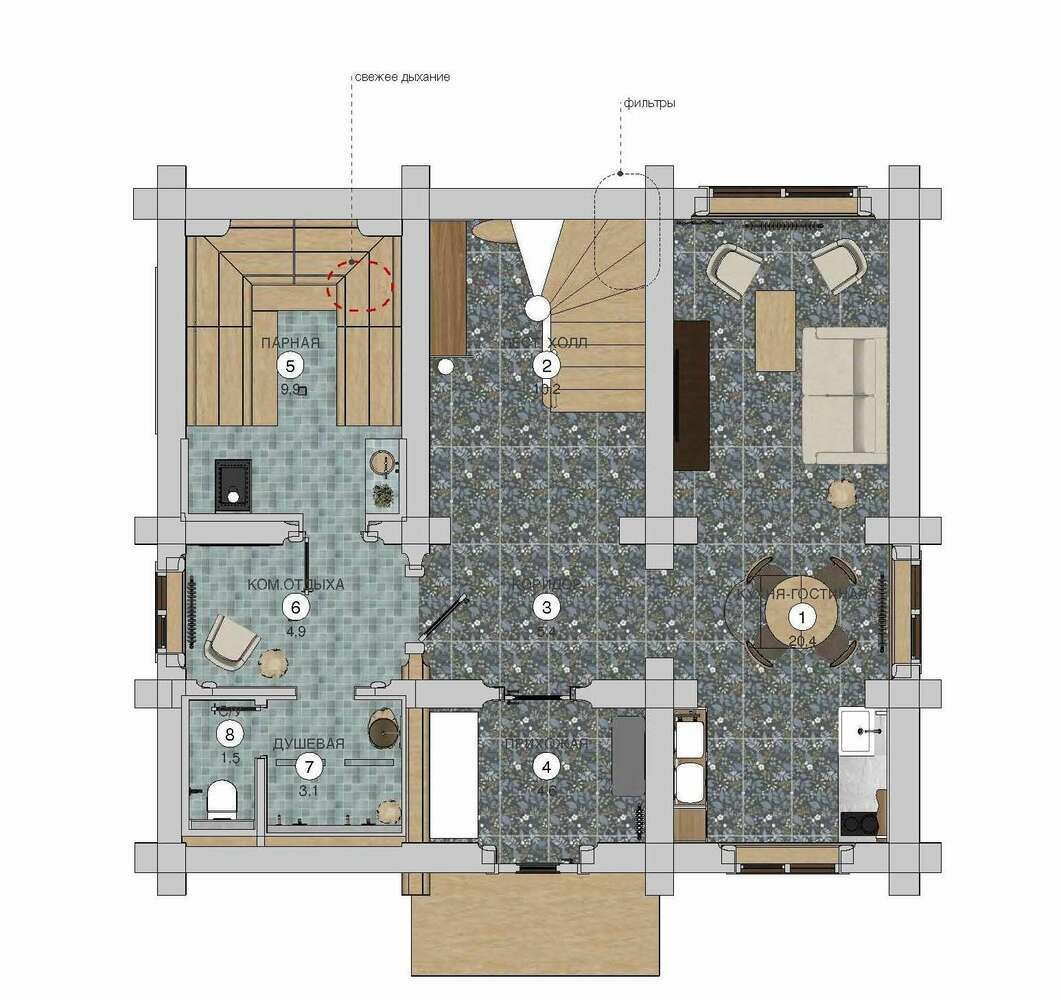 Лучший интерьер загородного дома 2024: дом-баня 130 м² из сруба со сказочными мотивамиДизайн