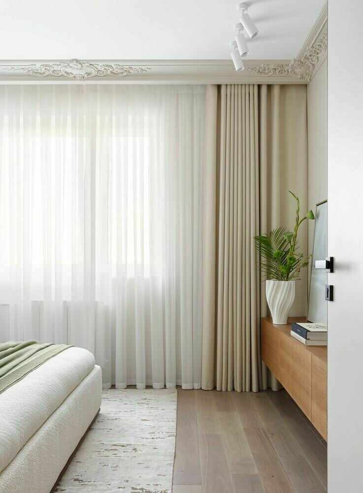 Шторы пошиты на заказ, они повторяют оттенок стен.