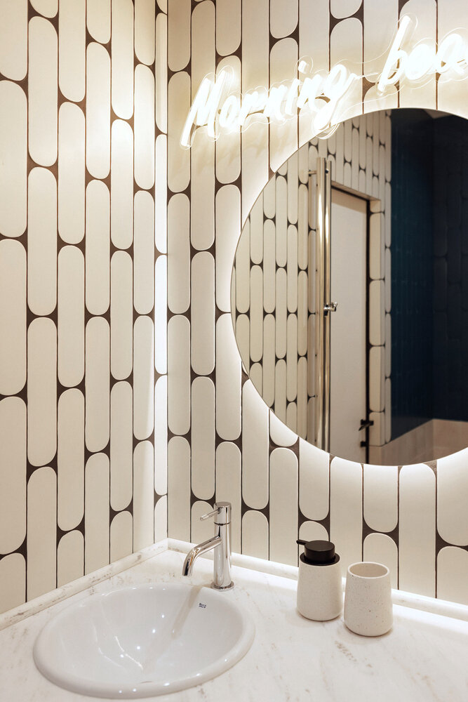 Для отделки санузла использовали мелкую плитку необычной капсульной формы — очень красивое и необычное решение.