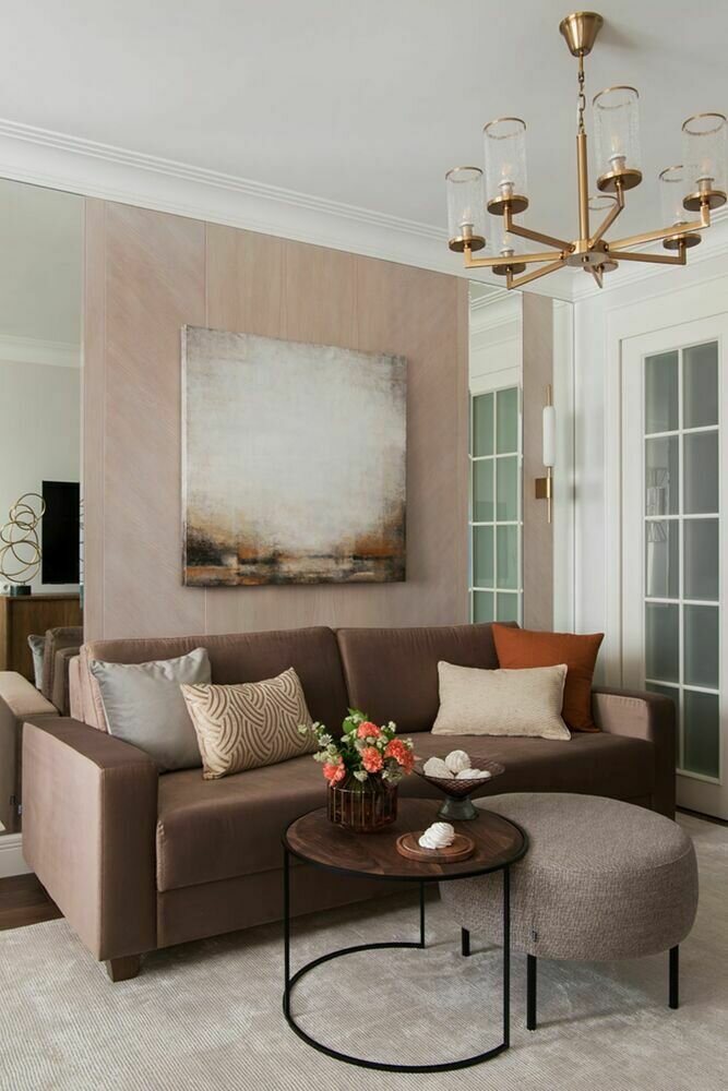 Стену за диваном в гостиной отделали шпонированными панелями с зеркальными вставками.