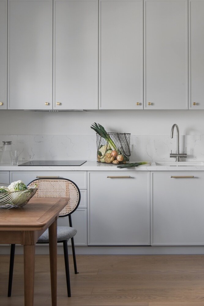 Кухонный гарнитур изготовлен на заказ в столярной мастерской по эскизам дизайнера. Максимально незаметный, но с нарядными и очень красивыми ручками.