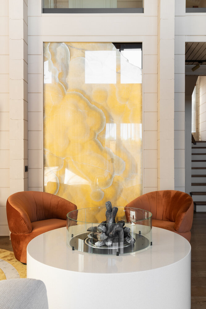 Дом 154 м² с биокамином и панно из оникса в гостинойДизайн