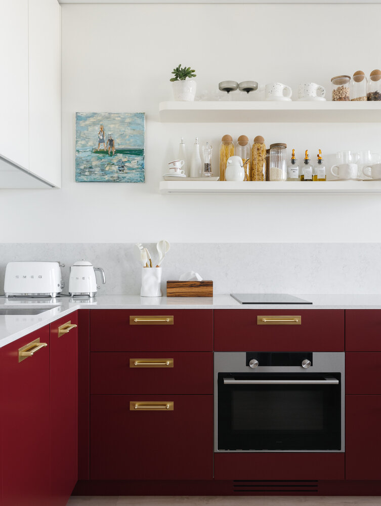 Встроенный маленький холодильник разместился за крайним нижним фасадом слева от мойки.