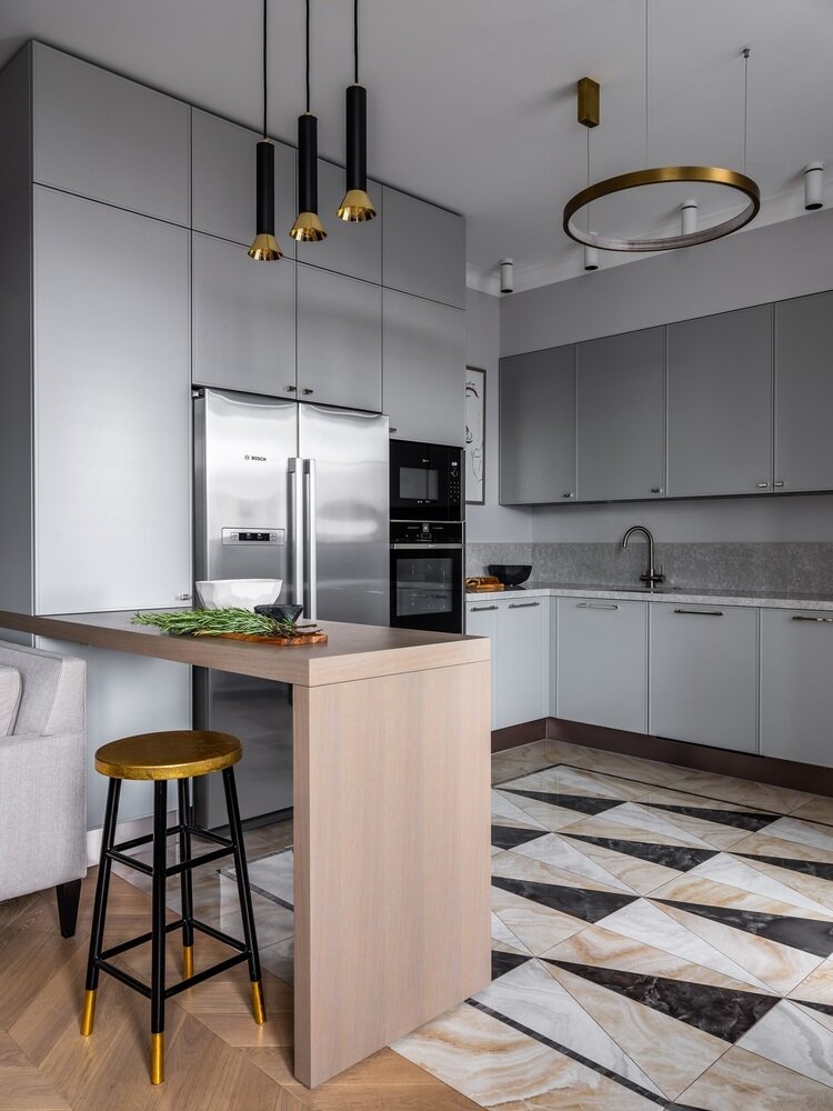 Пол на кухне выложен керамогранитом с фактурой натурального камня, который был распилен и уложен по заданному рисунку.