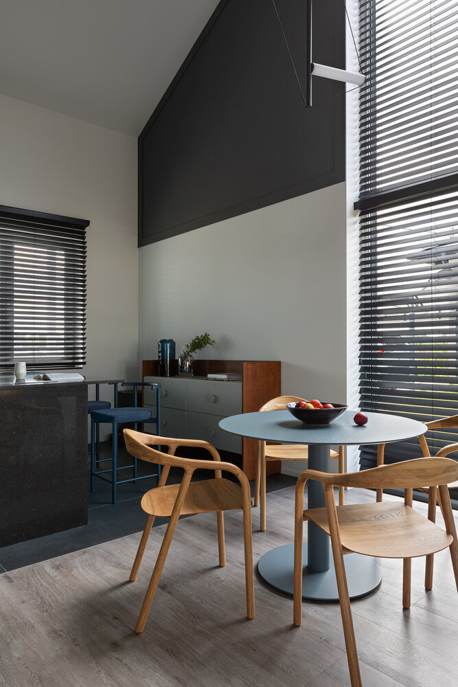 Для баланса пропорций верхний сектор стены в зоне гостиной выкрасили в графитовый оттенок.