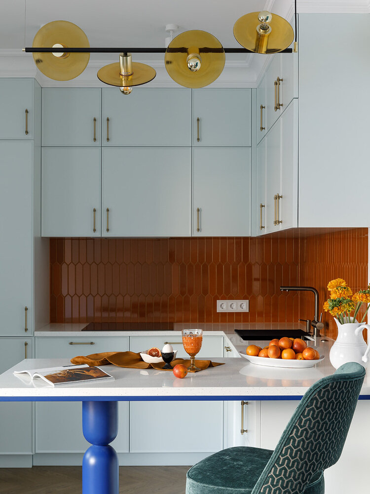В первой колонне располагаются витрина для посуды, СВЧ и духовка, во второй — встроенный холодильник. По одной стене расположили рабочую поверхность с плитой и встроенной вытяжкой, а по другой — зону с мойкой.
