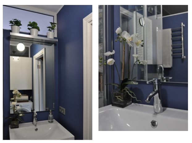 Мы решили максимально отказаться от плитки в пользу качественной краски для влажных помещений. Так мы сэкономили драгоценные сантиметры. Благодаря матовому синему цвету появились глубина и уют — ванная превратилась в настоящую маленькую комнату, к тому же с естественным освещением.