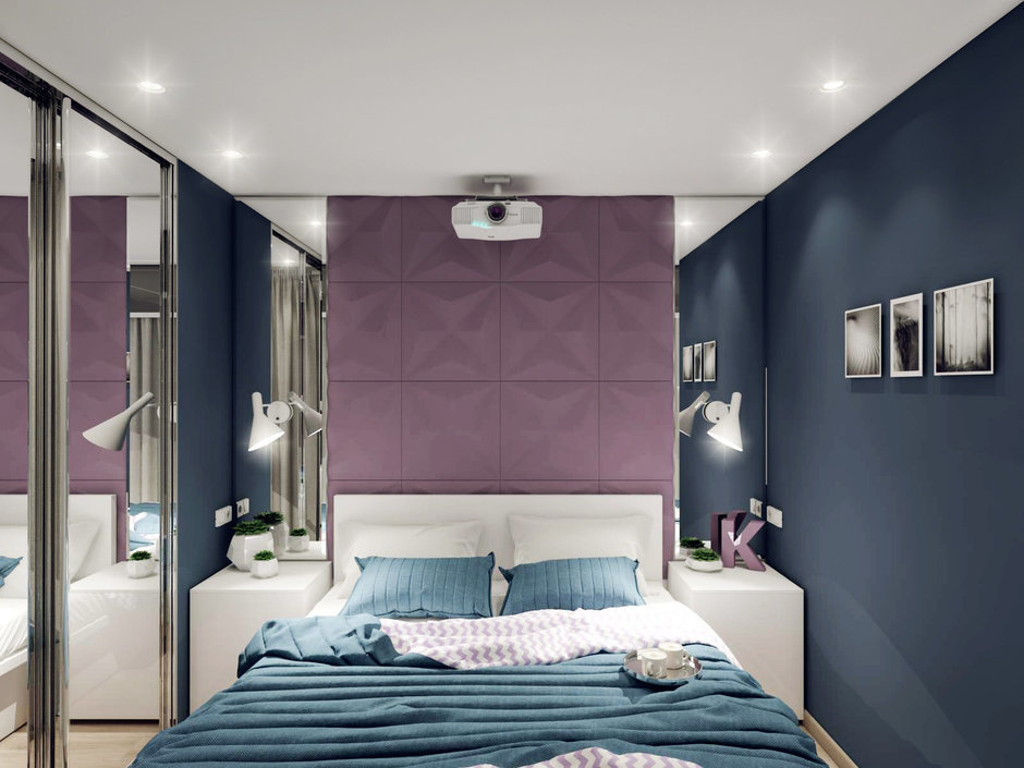 В спальне родителей мы оставили только необходимое – широкую кровать с лаконичным по дизайну изголовьем, зеркальный шкаф и стильные тумбы-кубы.