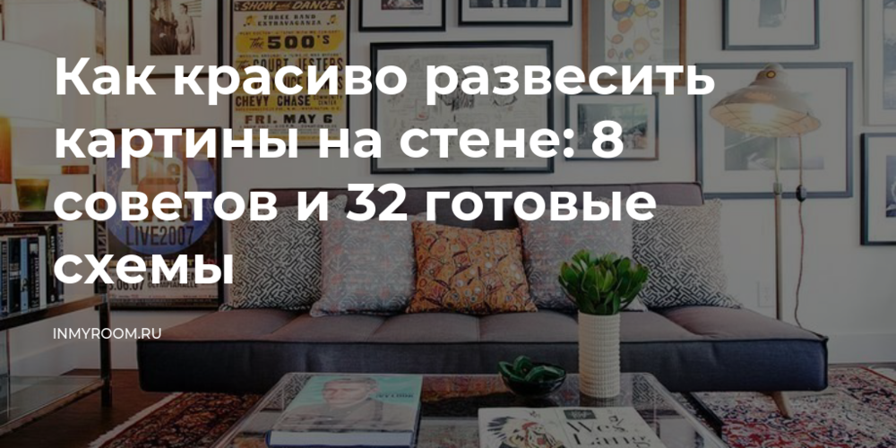 Перед тем как вешать картины или постеры, нужно определить высоту и размер композиции. Не следует размещать объекты слишком высоко – иначе на них будет неудобно смотреть. Встаньте напротив места, где в итоге будет висеть картина, фотография или панно. Отметьте уровень, куда упирается естественно брошенный взгляд (не поднимая и не опуская головы). От нижнего края полотна картины мысленно отступите 2–3 см. Именно эта часть изображения должна оказаться на отмеченном уровне. Если потолки низкие, то отступать нужно 6–7 см от нижней кромки полотна.