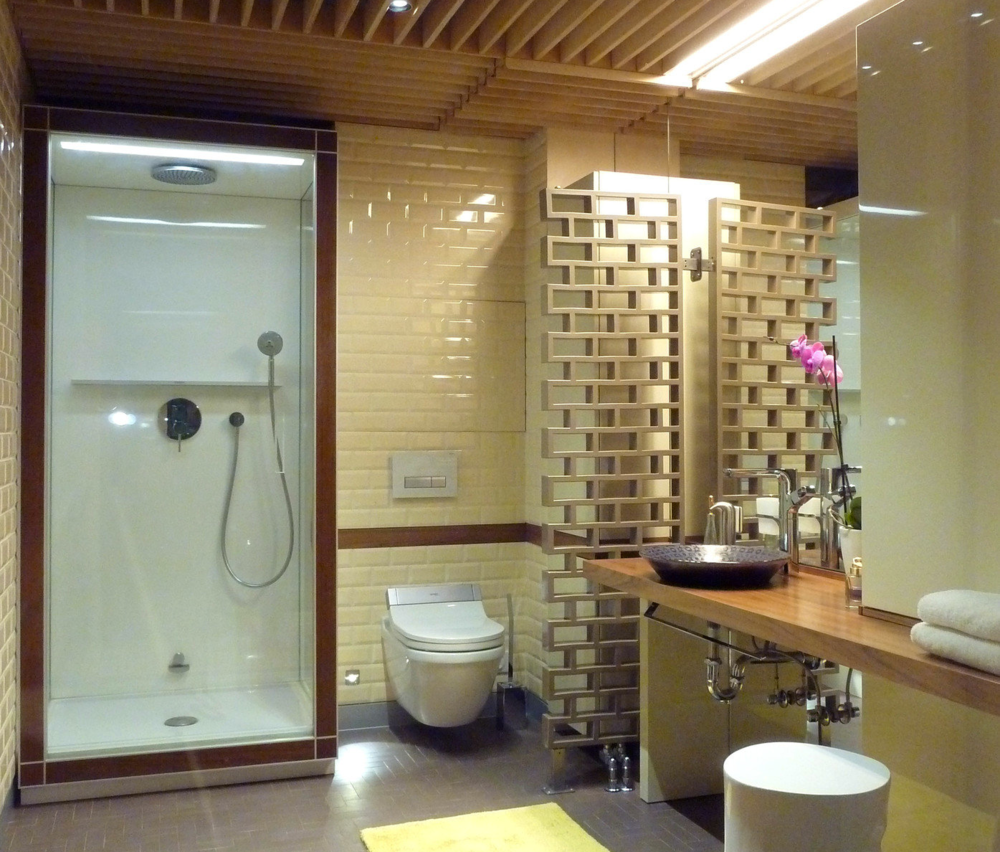 Перепланировку в санузле не делали — дизайнеры лишь немного изменили пропорции помещения. «Ванная комната в этой квартире напоминала колодезное помещение, была неуютной — все дело в высоких потолках. Но нам удалось сделать обстановку комфортной: мы подняли уровень пола, а внутри спрятали все коммуникации. Ванну мы „утопили“ с ним в один уровень и сверху накрыли деревянным настилом в стиле спа», — рассказывают дизайнеры.