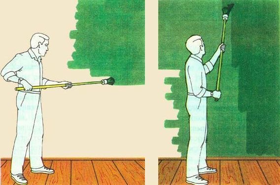 Запомните: стены нужно красить от угла, начиная от окна и заканчивая возле дверей. Чередуйте вертикальные, горизонтальные и диагональные мазки. Для прокраски углов — круглый валик, для стен — широкая кисть или валик.