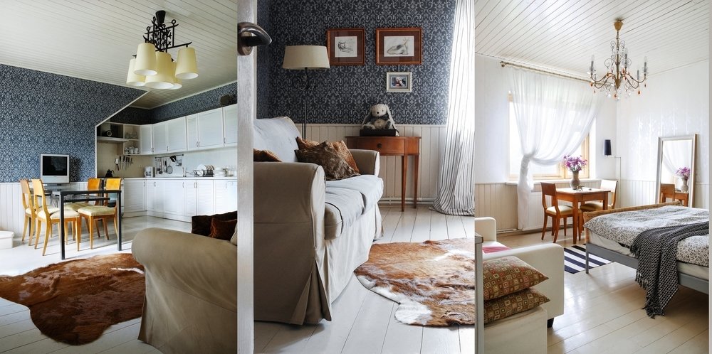 «Материалы для отделки мы выбирали, ориентируясь на бюджет, – рассказывает Галина. – Вместо шпунтованной доски нижнюю часть стен в комнате обшили евровагонкой, а в санузлах выложили плиткой. Остальные поверхности покрасили краской, а вот для спальни и студии использовали обои – так уютнее. Для пола сосновая доска подошла лучше всего.