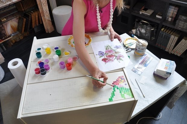 Что делать? Намечаем на основе рисунок и начинаем «вышивку» – почти как на ткани, только уже на мебельном фасаде. Украсить всю композицию можно такими же самодельными помпонами, посаженными на клей.