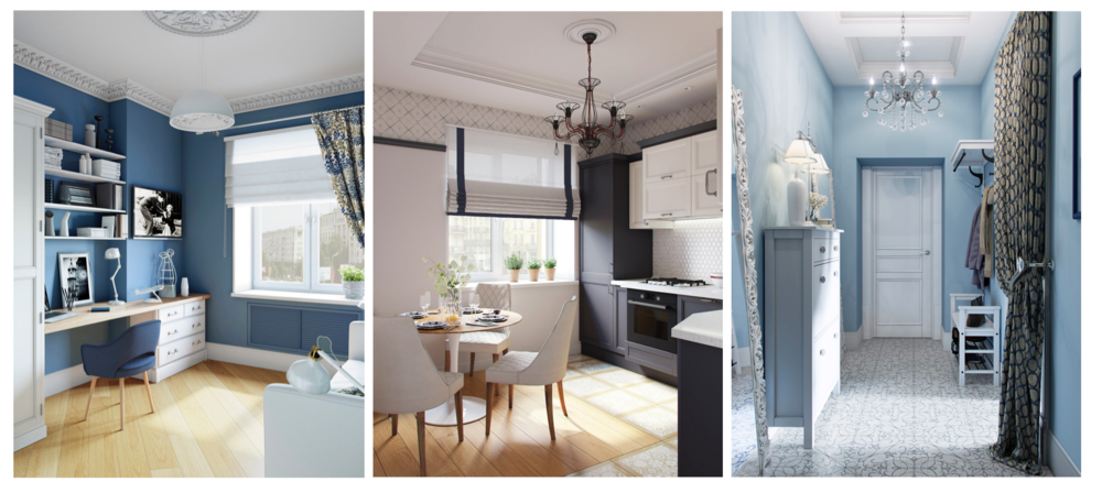 Работа началась с того, что дизайнеры составили карту квартиры, условно обозначив цветовые «пятна» (те предметы, что уже были в наличии). Заказчикам предложили смелую идею: использовать глубокий синий цвет – и, к радости дизайнеров, они согласились! «Интересно, что после согласования цветовой палитры, мы с Надей увидели фильм «Приключения Электроника», где квартира профессора Громова как раз находится в сталинском доме и выполнена в синих тонах. Это был знак, что мы на верном пути», – улыбается Алена.