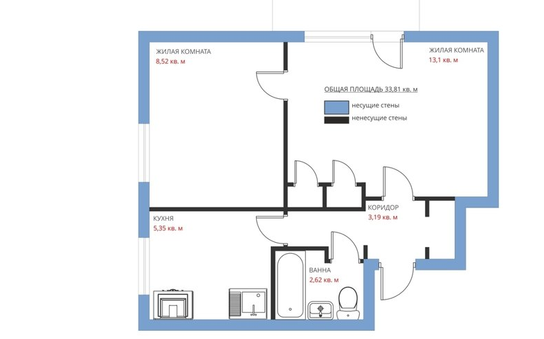 Квартиры в серии очень миниатюрные: так, двухкомнатная квартира размещается на площади 33 кв. м – по современным нормам это немного даже для однокомнатной квартиры. Усугубляет ситуацию еще и проходная комната.