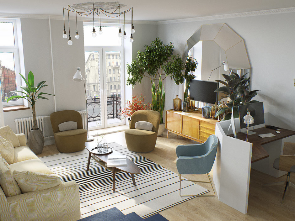 Интерьер оформлен так гармонично, что не сразу заметишь, что почти вся мебель и свет – предметы из ИКЕА. «На заказ будет сделан только диван, так как нам нужна нестандартная широкая модель», – добавляет дизайнер.