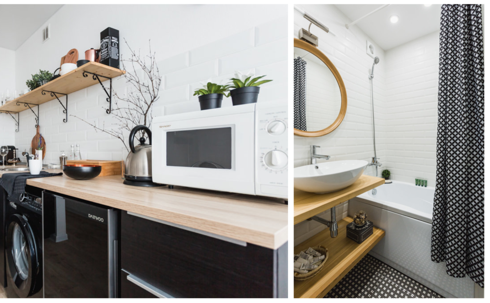 Мебель для этого интерьера подбирали практичную: нужно было вписаться в заданную концепцию минимализма и небольшой бюджет. Практически все предметы обстановки нашли в ИКЕА и Hoff. В спальне-гостиной поставили двуспальную кровать и раскладывающийся диван. На кухне нашлось место для углового гарнитура и обеденного стола. К черным шкафам ИКЕА подобрали черную бытовую технику: стиральную машинку и небольшой холодильник.
