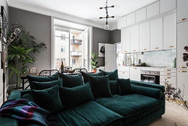 Обитый модным сейчас бархатом диван в центре комнаты разделяет гостиную и столовую, а зона кухни выделяется из темного окружения контрастными белыми фасадами и фартуком под мрамор. Кухонные шкафчики продлены до потолка: получилась удобная и вместительная зона хранения.