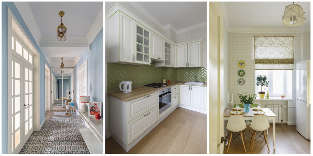 Для отделки выбрали доступные материалы: качественный ламинат, краску для стен и дизайнерские обои в качестве акцентов. Катя Чистова использовала в проекте несколько видов плитки: с разноцветными узорами в прихожей и на балконе и знакомый всем «кабанчик» в ванной и на кухне – на фартуке его выложили узором «шеврон».