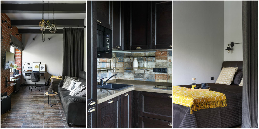 Оставив пространство единым, дизайнер разделила его на зоны при помощи мебели и текстиля. Так, кухню от гостиной отделяет высокий стол с барными стульями, который использовали вместо обычной обеденной группы. А спальня «прячется» за плотными портьерами на кованном карнизе, который закрепили на потолочной балке.