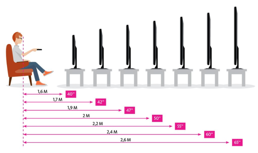 Прежде всего определитесь с подходящим размером. Оцените, с какого расстояния вы будете смотреть телевизор, а именно, с точки расположения дивана или кресел.