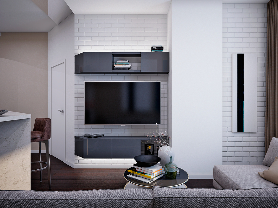 Если скрывать чудо техники желания нет, то просто подберите для него идеальный фон. Если вы еще на этапе поиска идеи для оформления интерьера гостиной, возьмите на заметку: телевизоры чудесно смотрятся на фоне лаконичной однотонной стены. Это может быть белая кирпичная отделка, матовые обои или краска хорошего оттенка – в зависимости от сочетаемости с остальным контекстом. Светлый тон отлично подойдет для маленькой гостиной, сделав ее воздушнее и визуально просторнее.