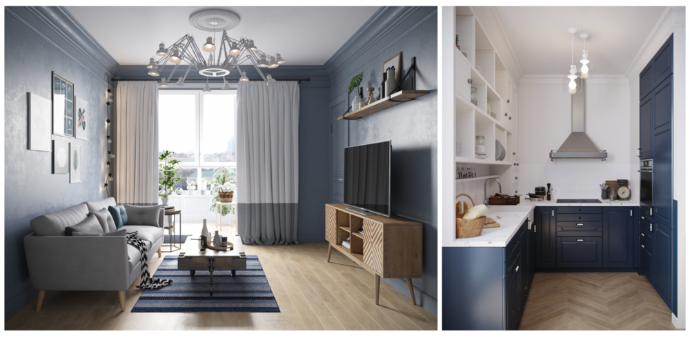 Скандинавский стиль взяли за основу при подборе колористического решения. Отдали предпочтение белой и серой краске, дополнив ее оттенками синего и голубого, которые разнообразят интерьер. А чтобы придать ему завершенности, по периметру всей квартиры пустили гипсовый карниз, выполненный на заказ. Завершает этот теплый и уютный образ паркетная доска на полу и натуральное дерево в предметах мебели и декора.