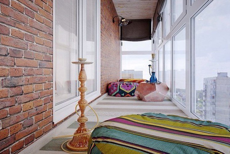 Что нужно сделать: утеплить балкон, обязательно сделать теплый пол. На пол положить подушки – разные по размеру и форме. На окнах можно сделать драпировки в ярких, «восточных» оттенках. Дополнят интерьер небольшие пуфики в марокканском стиле.