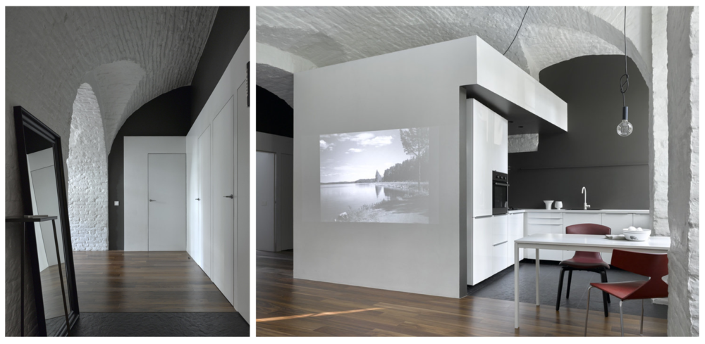 Слабую инсоляцию компенсируют высокие сводчатые потолки, отражающие свет. В центральный куб в верхней части встроили скрытые светильники для освещения гостиной. Лампа есть только над обеденным столом.