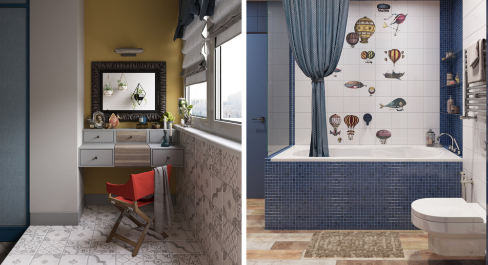 На заказ сделана и почти вся мебель, использованная в проекте: барная стойка с железной опорой, кожаный диван в гостиной, кровать в спальне, диваны в детской и на кухне, туалетный столик на балконе, тумба в санузле.