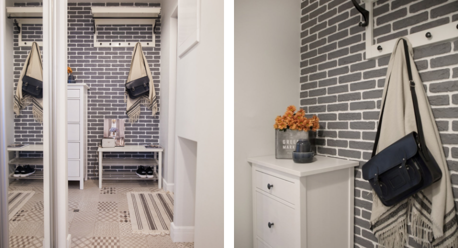 Кирпичную кладку продублировали и в коридоре, который остался в тех же границах, что были предусмотрены изначальной планировкой. В трехкомнатных квартирах, расположенных в домах серии П-44, сносить можно только одну перегородку, между коридором и гостиной, все остальные – несущие, поэтому перепланировку не затевали. Лишь выстроили в спальне гардеробную, а в прихожей – встроенный шкаф от пола до потолка.