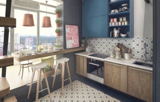 Однотонные и спокойные кухонные фасады больше не в тренде. Верхняя и нижняя части гарнитура должны отличаться если не по цвету, то хотя бы по фактуре. Кроме того, особой популярностью пользуются все оттенки синего или натуральные древесные тона.
