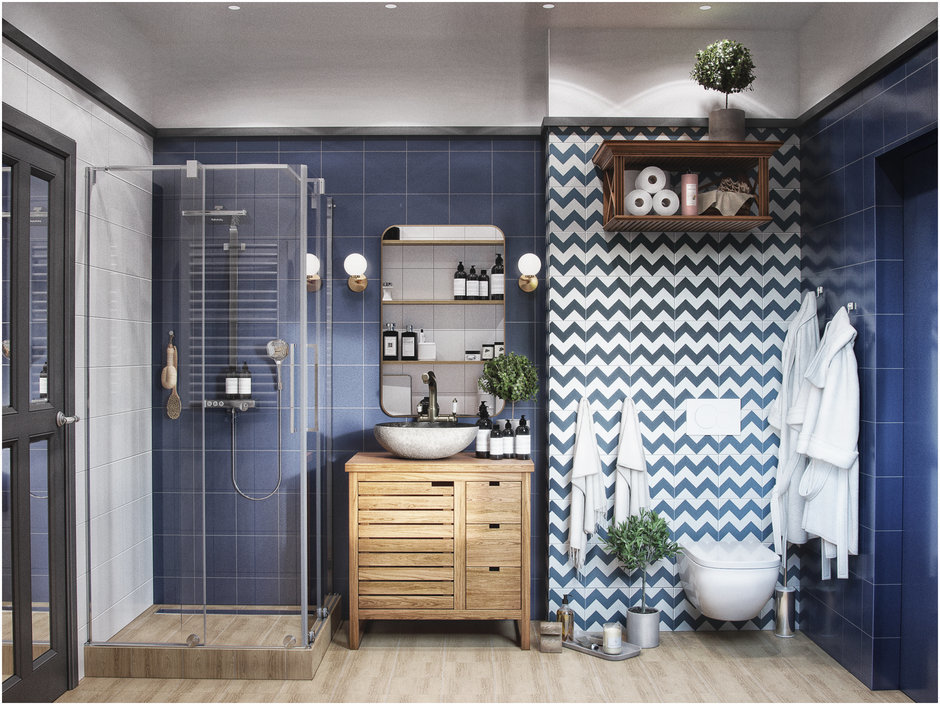 Понятно, что главный отделочный материал в этом доме – дерево, но его обилие может «зажелтить» общую картину. Поэтому в интерьер добавили синие акценты и белые нейтральные поверхности. К тому же, как считает Макс Жуков, синий шикарно смотрится вместе с медью и черненым металлом, которые уже стали фирменным знаком ToTaste Studio.